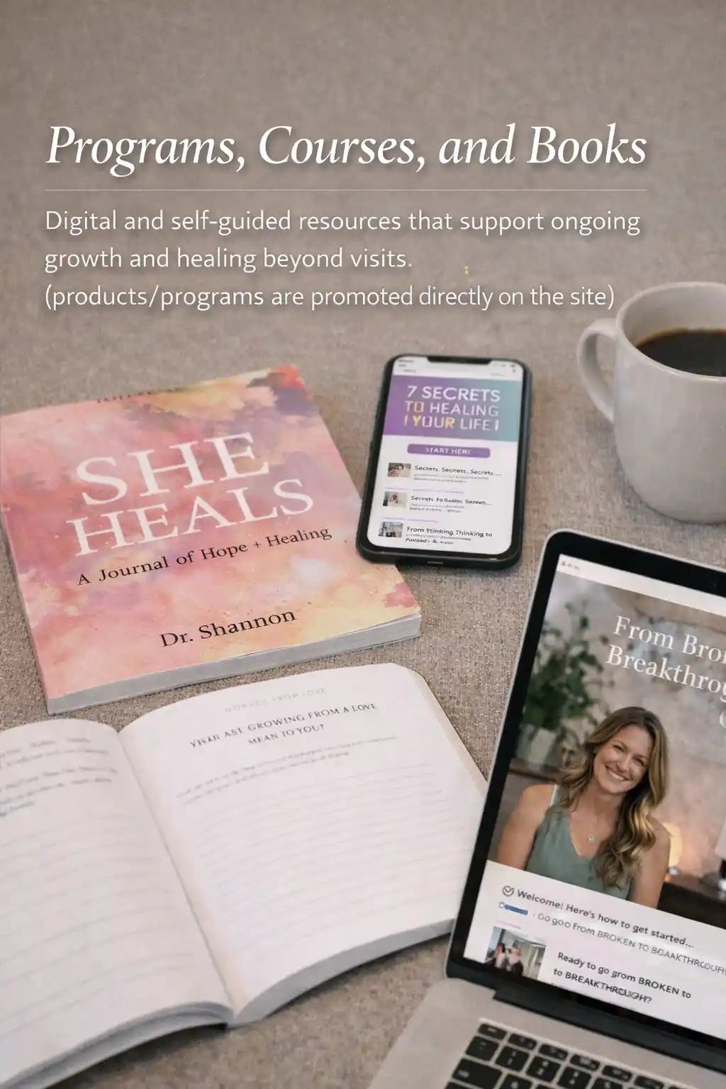Digital and self-guided resources that support ongoing growth and healing beyond visits (products/programs are promoted directly on the site).